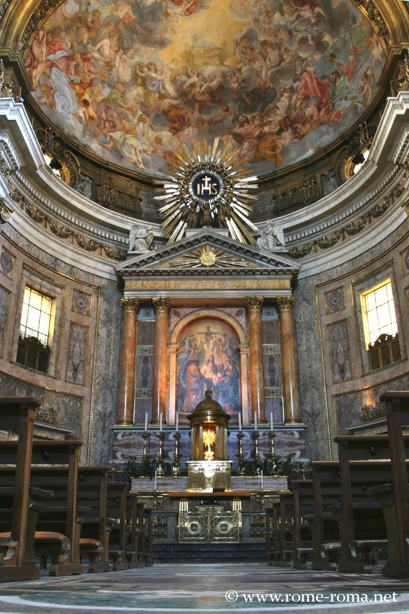 La voûte est ornée d’une impressionnante fresque centrale avec un effet de perspective unique, illustrant le Triomphe du nom de Jésus, peinte par Giovan Battista Gaulli entre 1676 et 1679. L’endroit de la nef d’où la vue sur l’œuvre est optimale est indiqué au sol par les lettres « IHS » (les premières lettres du nom de Jésus en grec). C’est le même artiste qui réalisa la fresque de la coupole.