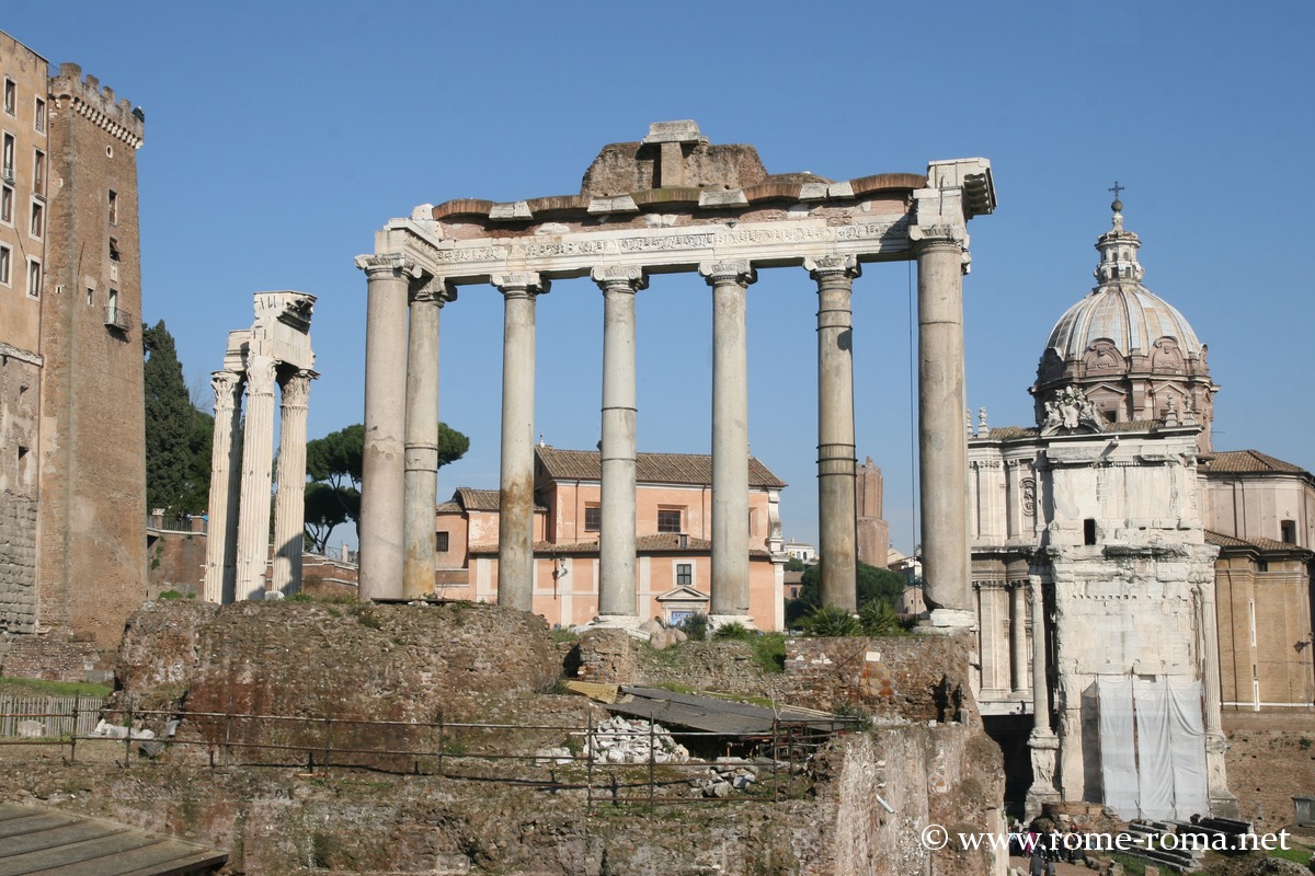 Le temple de Saturne est le plus ancien du forum après ceux de Vesta et de Jupiter, consacré vers 497 avant J.-C. mais existant probablement depuis la Rome royale.