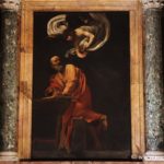 Saint Matthieu et l’ange est la dernière des trois toiles peintes par Caravage, avec une première version qui fut rejetée pour son réalisme excessif. Dans celle-ci, l’ange guidait directement la main de Matthieu qui n’avait l’air de ne pas maîtriser l’écriture (perdue à Berlin pendant la Seconde Guerre mondiale, il n’en reste que des photographiques).