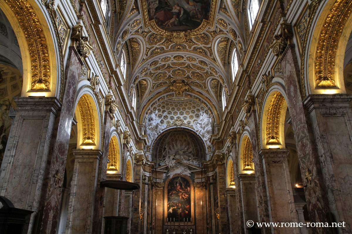 Elle est formée de trois nefs avec cinq chapelles de chaque côté, une décoration baroque d’un foisonnement de marbres, dorures et sculptures.
