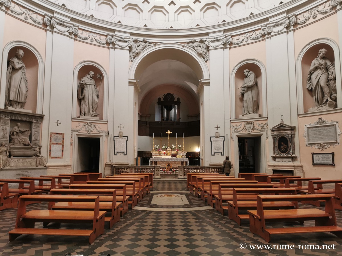 A l’intérieur, les parois intérieures sont ponctuées de niches abritant huit statues de saints, sculptées entre 1600 et 1603 par Camillo Mariani, à la charnière entre maniérisme et baroque, avec : saint Augustin, sainte Monique, sainte Marie-Madeleine, saint François d’Assise, saint Bernard de Clairvaux, sainte Catherine d’Alexandrie, sainte Catherine de Sienne et saint Jérôme.